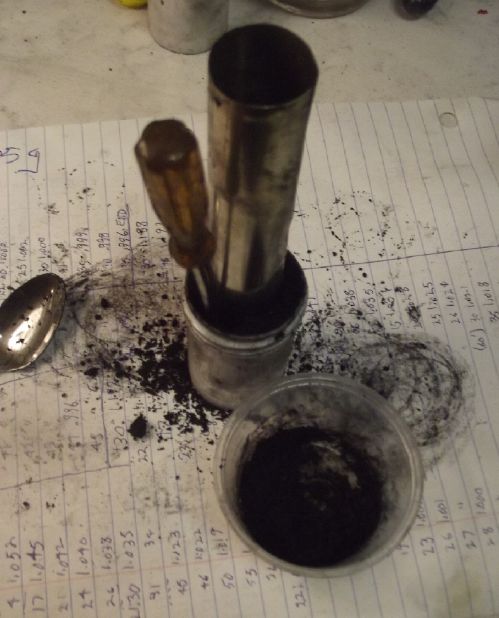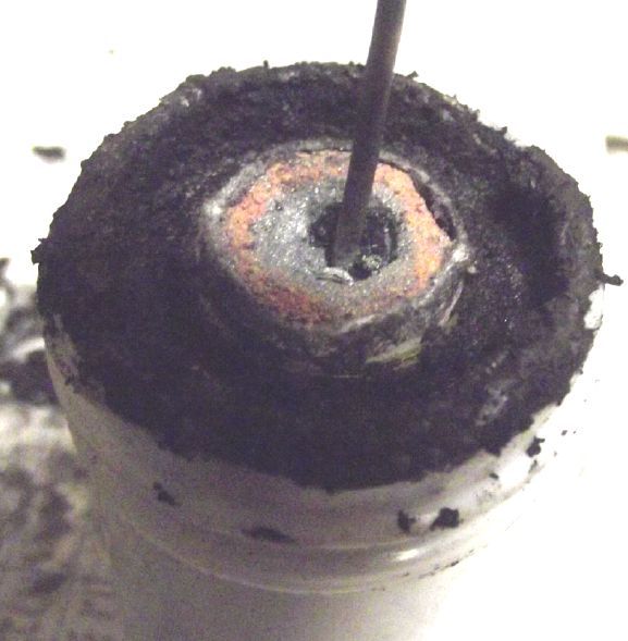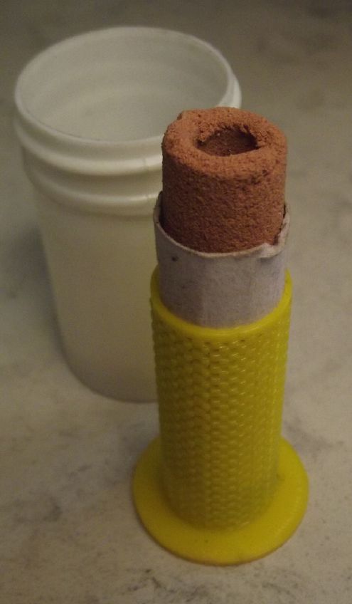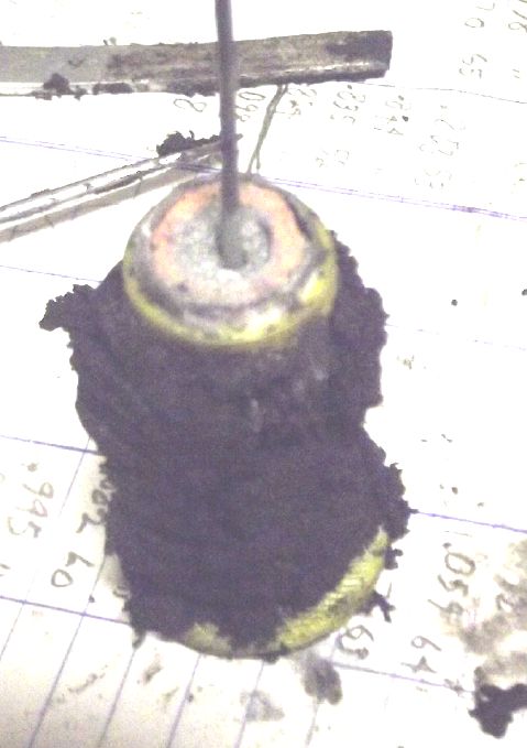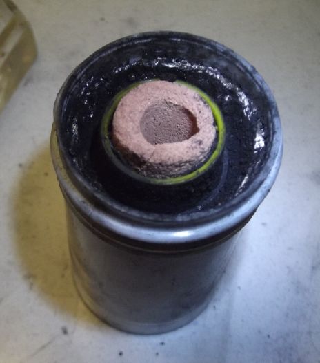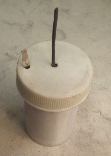 I further improved the cell design. Now the sand and clay 'pot' with the zinc powder is surrounded by a perforated plastic outer 'basket', with the separator paper protected between the pot and the basket. All the pressing and munching on the outer (+) electrode substance to pack it in can't abrade or rip the paper. (Perhaps I can make the next 'basket' thinner and more ethereal for better interface area? ...or even just melt some stiff plastic fibers into the outer surface of the paper to make it tougher and more rigid? Some sort of open mesh polyethylene maybe? Hmm!)