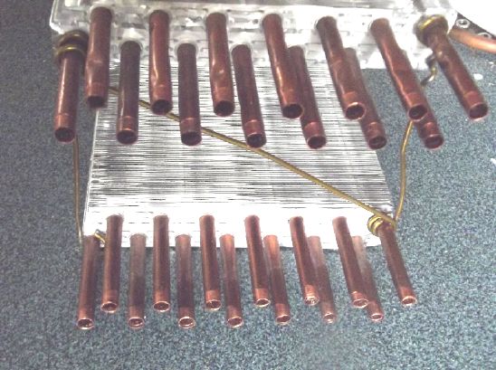 I also made a rectangular pipe "manifold" with holes to solder the seven tubes of one layer of one of them. Things didn't quite line up because of slightly bent tubes. I decided I would have to make a special pipe bender to straighten them out and get them all perfectly aligned.