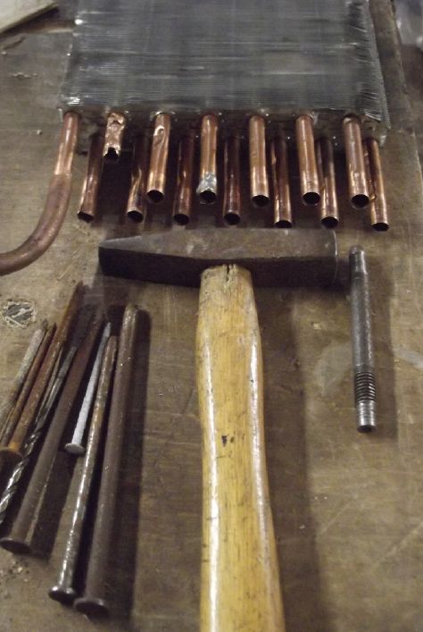 In order to do that, first I made a little punch to expand the radiator pipe ends a bit so they fit inside the curved pieces better, and of course there was a lot of pipe cleaning prep.